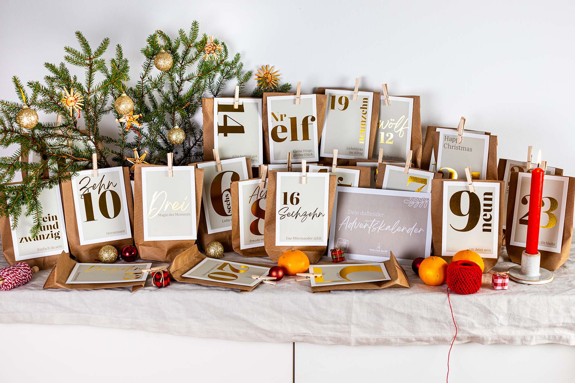 • 24 Türchen mit duftenden Überraschungen und jeweils einer liebevoll gestalteten Karte